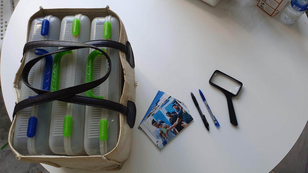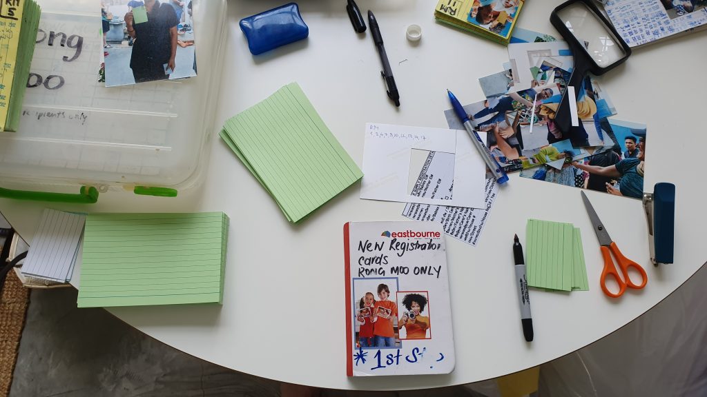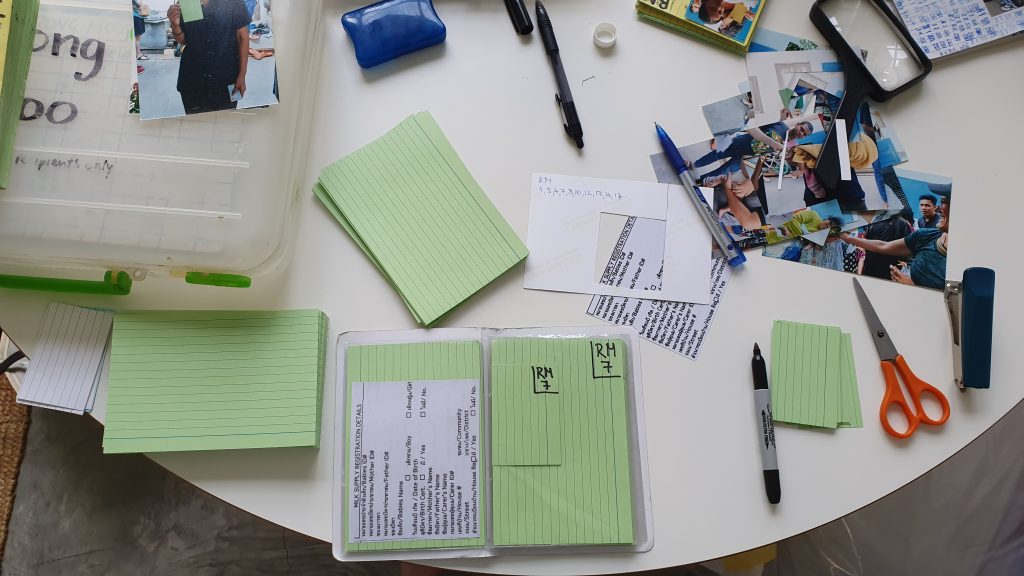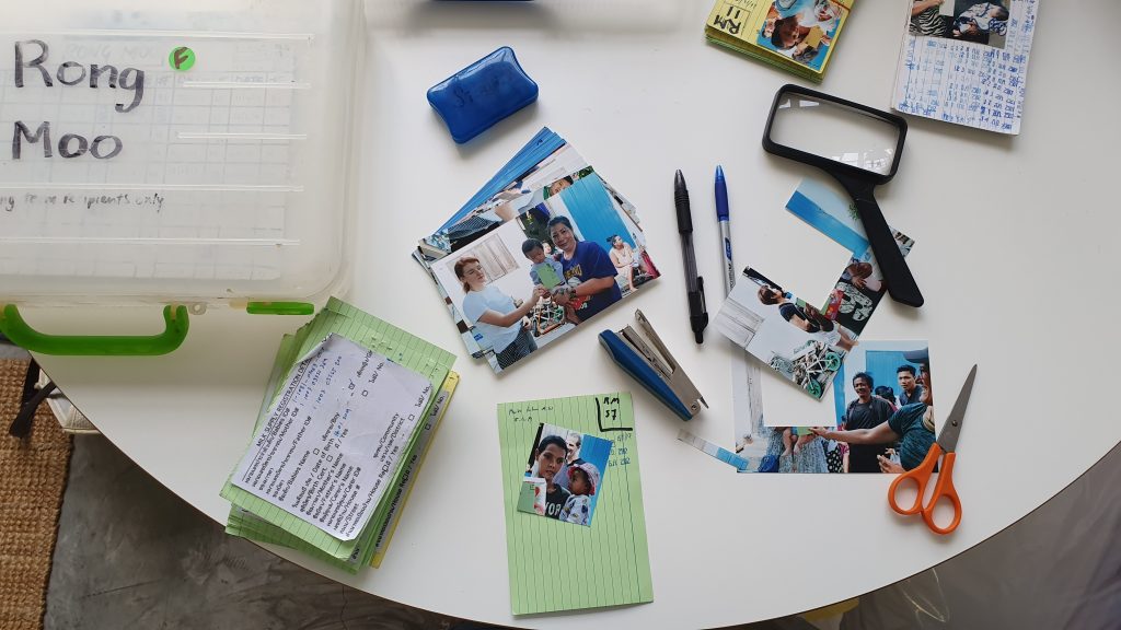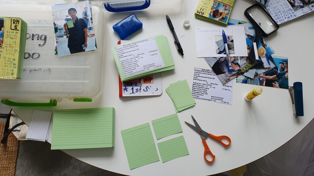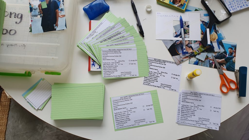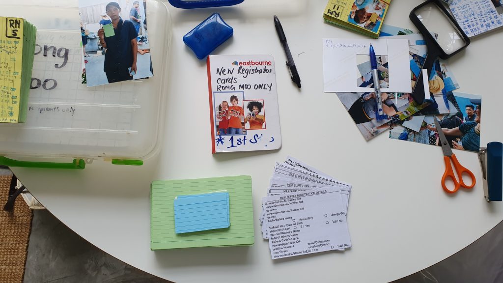Registration cards live in 3 separate boxes: 1 for the office supplies (blue handle) and 1 box each for the recipients from Rang Moo and Suan Ooy communities. Every 2 weeks, as we register new moms and have their pictures taken, we update the cards…We do 1 community at a time, first step: is to add the new photos to the cards. The photos should be taken from some distance so they can be cut to fit in the top-left corner of a registration card. A photo should clearly show faces of both mom and the baby.Once the photos are attached to the corresponding cards, second step: is to create enough new registration cards so we can add more moms that will come for the first time. The new registration cards are saved in small photo albums marked with “*1st” and “*2nd” – Rang Moo and Suan Ooy. New cards should be numbered using the numbers that are not used in the current stack of registration cards. To create more blank registration cards, the third step: is to make more photocopies of registration form, cut them into individual size and… … glue them to index cards we purchase at B2S or another office supply store. Finally, each new registration card should also have a corresponding small card that a mother will get to carry and show us when they come to collect milk formula. We create these small cards by cutting the index card in 4 equal pieces.