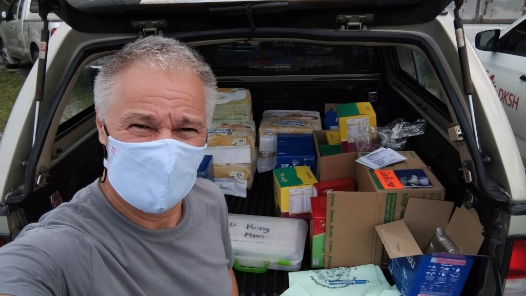 I delivered 14 boxes of formula in Rong Moo and gave 4 packs of baby diapers. In Suan Ooy, another 14 boxes and 1 pack of diapers. All was done from 7am until 9:30am.