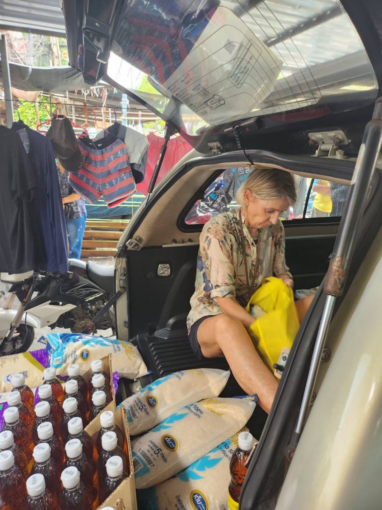 Miron came to join us for the first time. He and I went shopping at Makro and the Klong Toei market, packed the car with 57 sets of rice, cooking oil, fish sauce and dried pork and let it parked in the usual parking spot for the afternoon delivery.