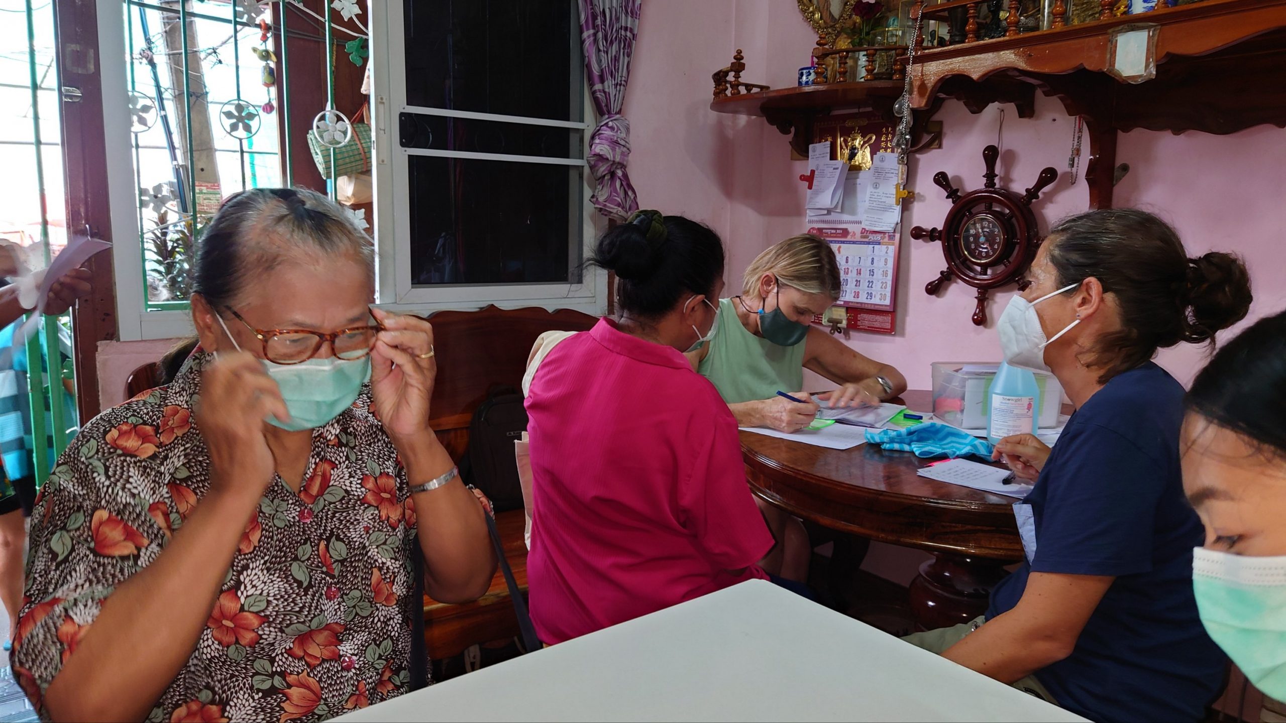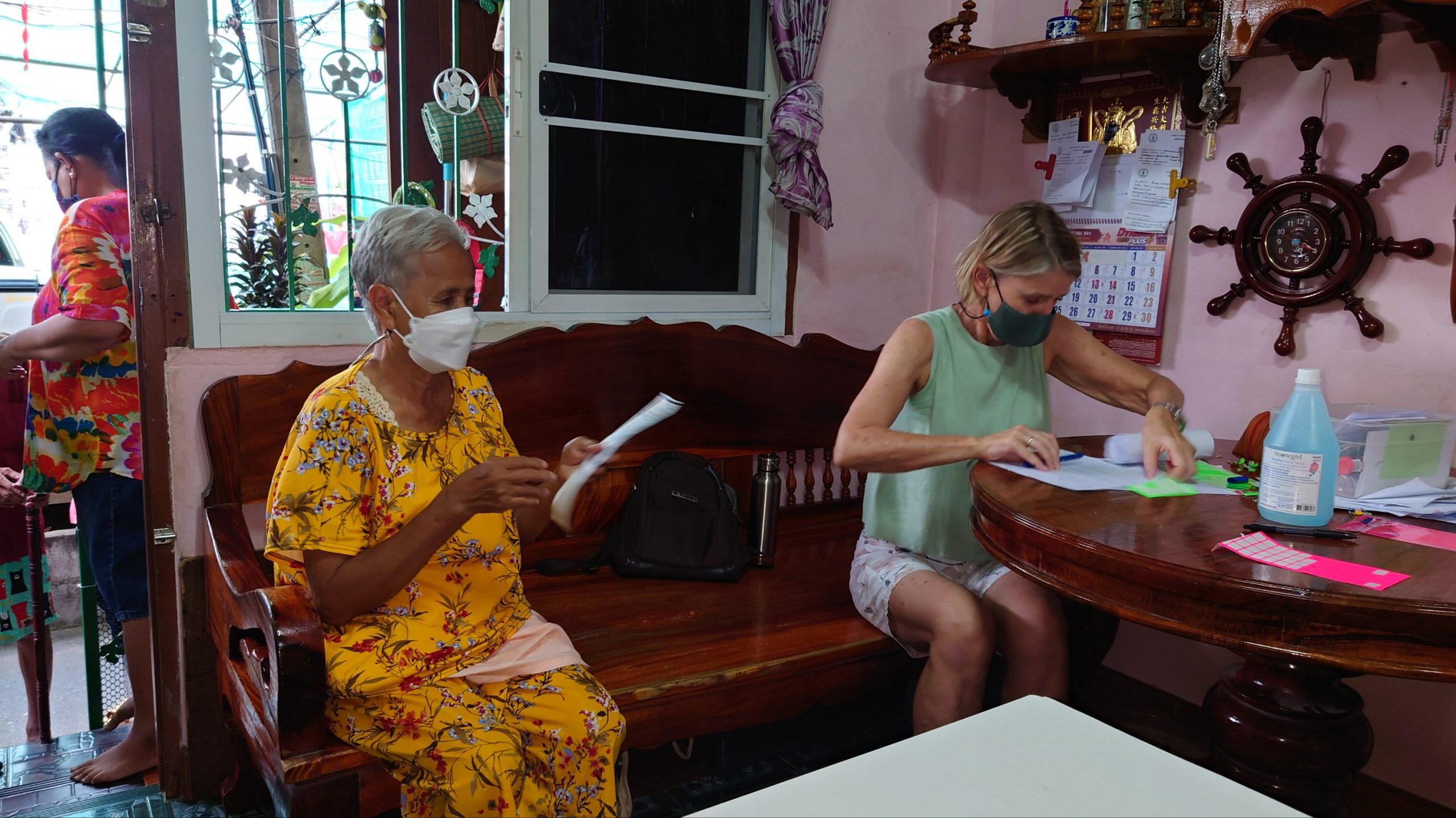 Janna and Sophie came to help and as has been the case for several past registrations, Khun Jim was kind enough to let us use her living room to interview people who came to apply for help.